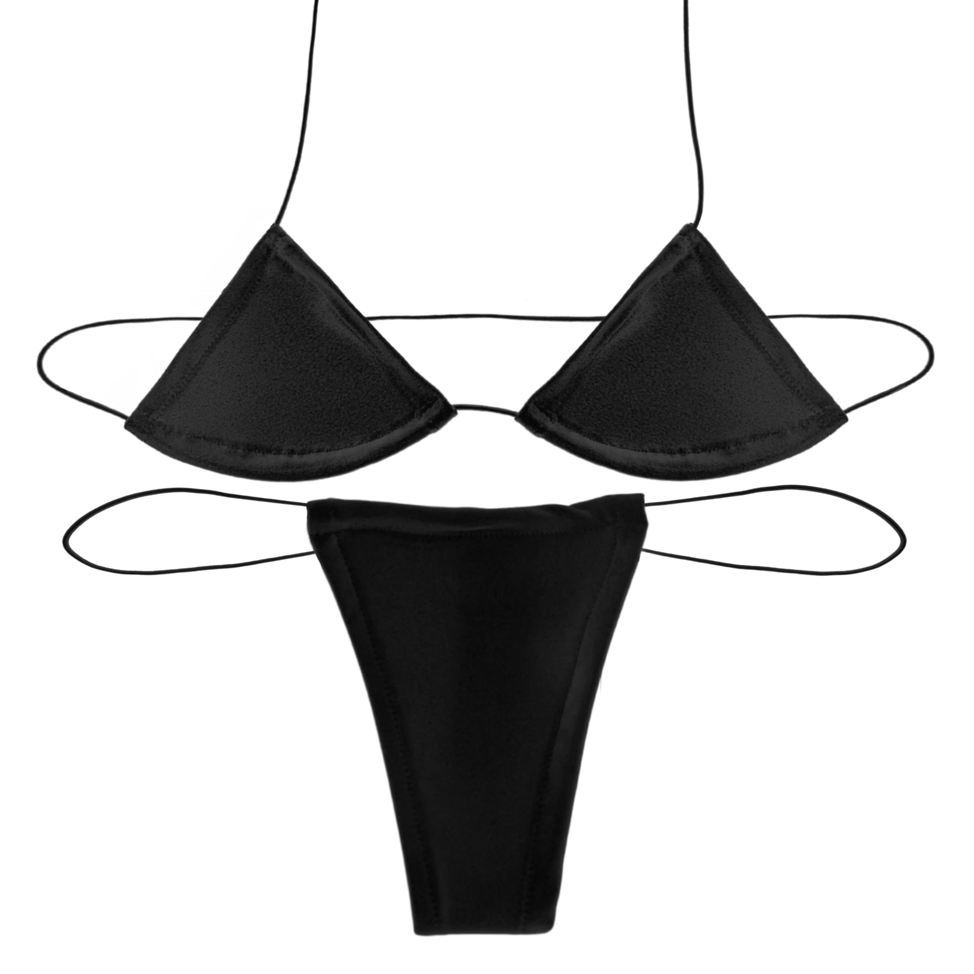 One Size. Lined bottoms. Extremely minimal coverage. Elastic cord straps are each approximately 26 inches and stretch to 55 inches. Fabric pieces are 3.75-4 inches at their widest.