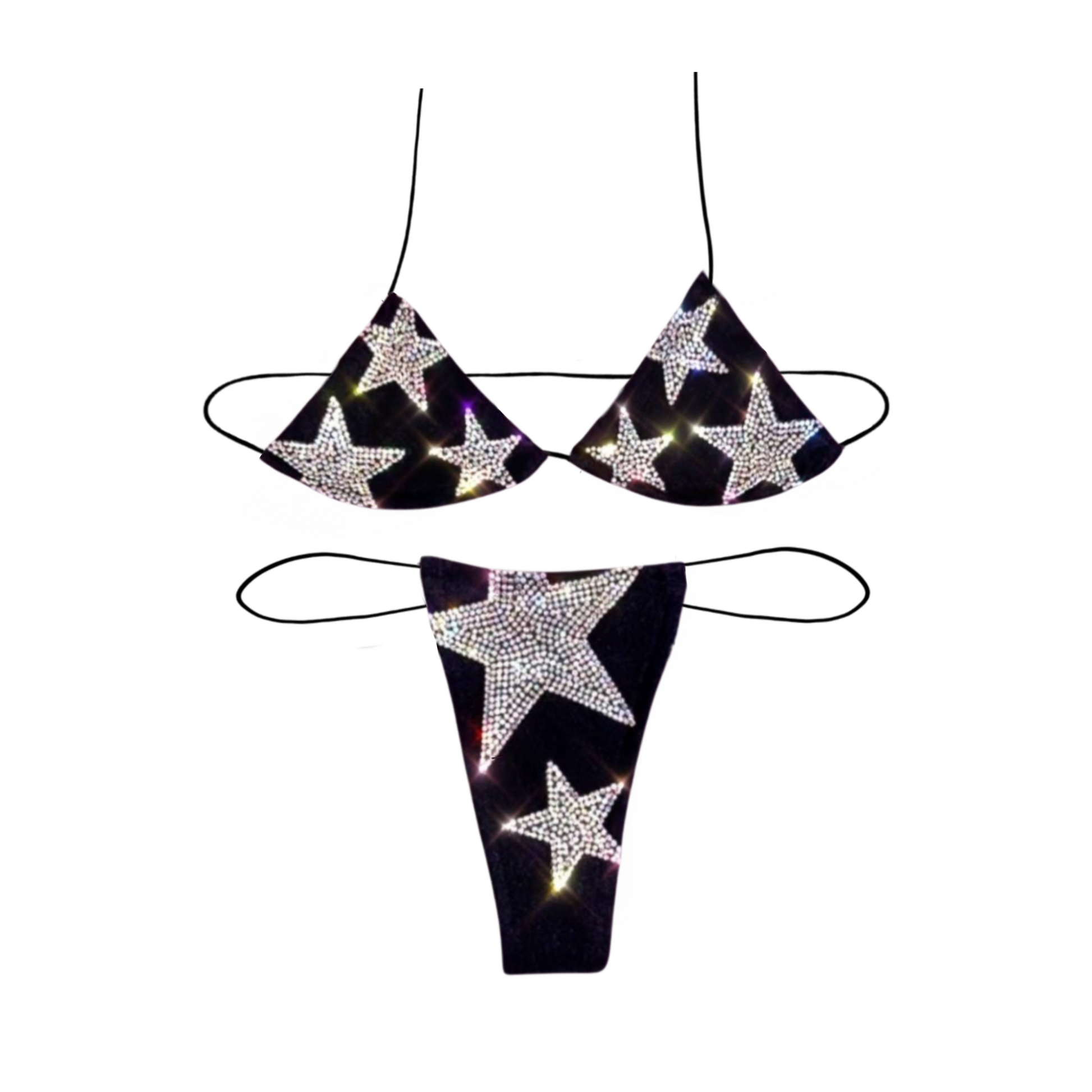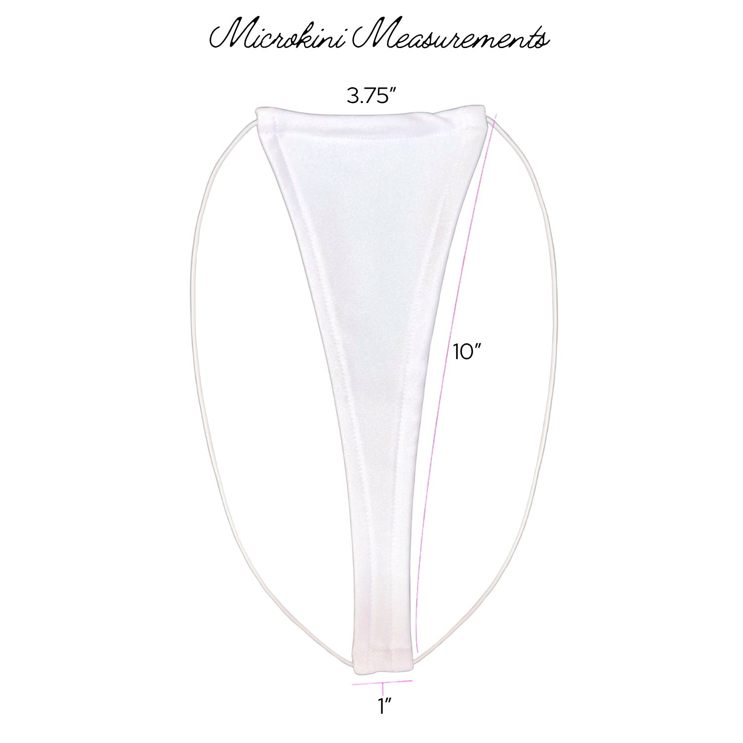 One Size. Lined bottoms. Extremely minimal coverage. Elastic cord straps are each approximately 26 inches and stretch to 55 inches. Fabric pieces are 3.75-4 inches at their widest.