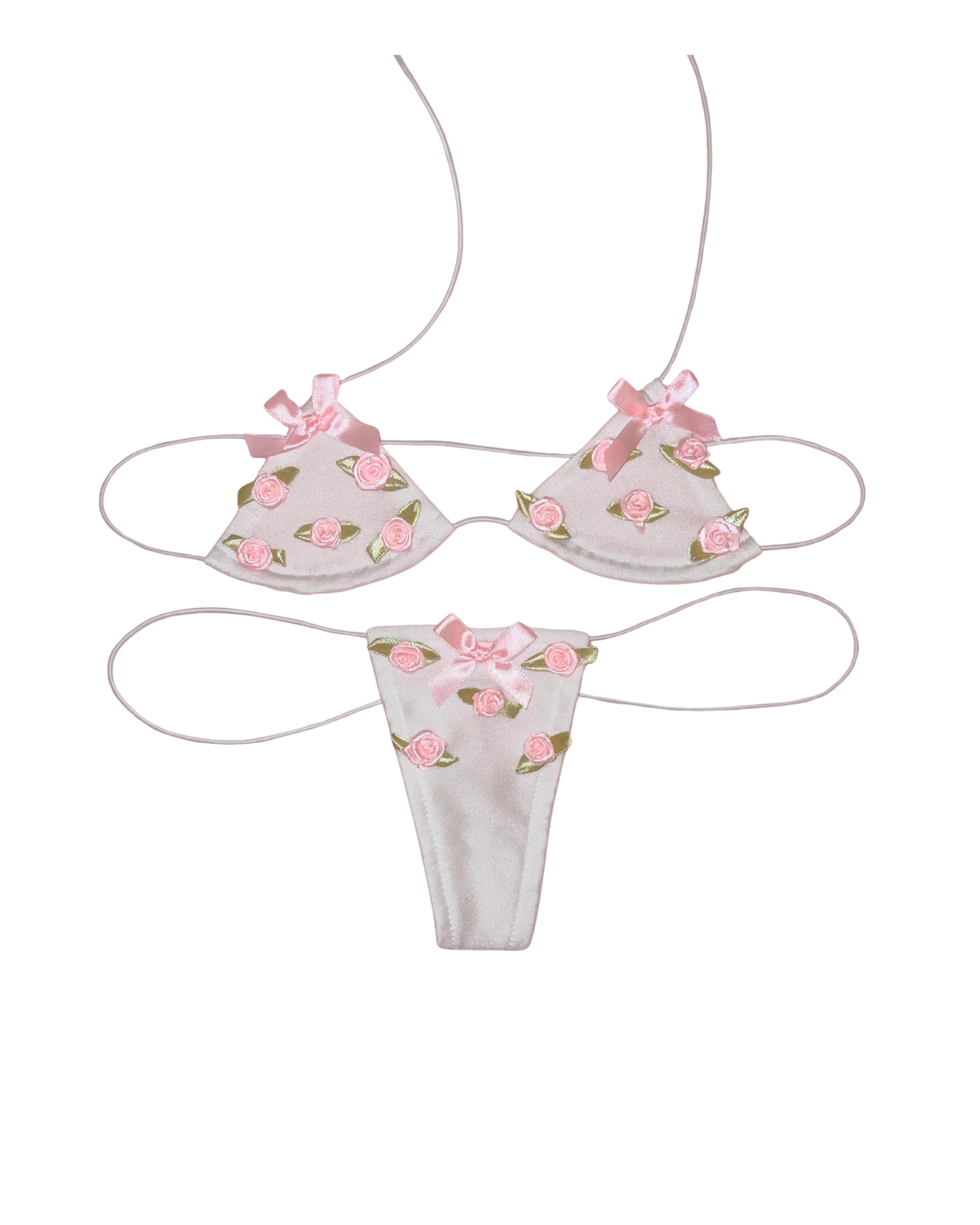 One Size. Lined bottoms. Extremely minimal coverage. Elastic cord straps are each approximately 26 inches and stretch to 55 inches. Fabric pieces are 3.75-4 inches at their widest.