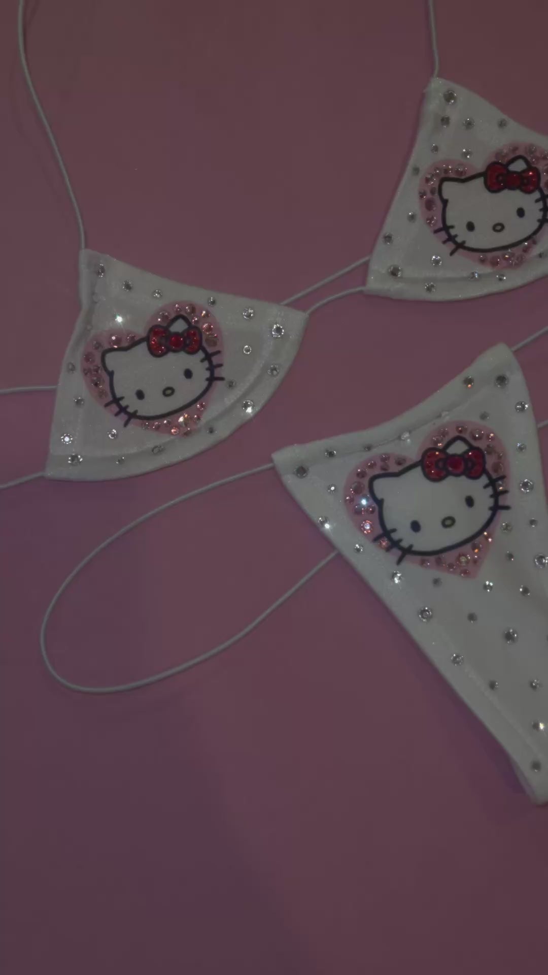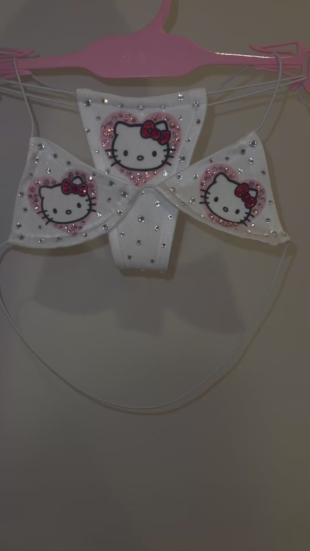 One Size. Lined bottoms. Extremely minimal coverage. Elastic cord straps are each approximately 26 inches and stretch to 55 inches. Fabric pieces are 3.75-4 inches at their widest.