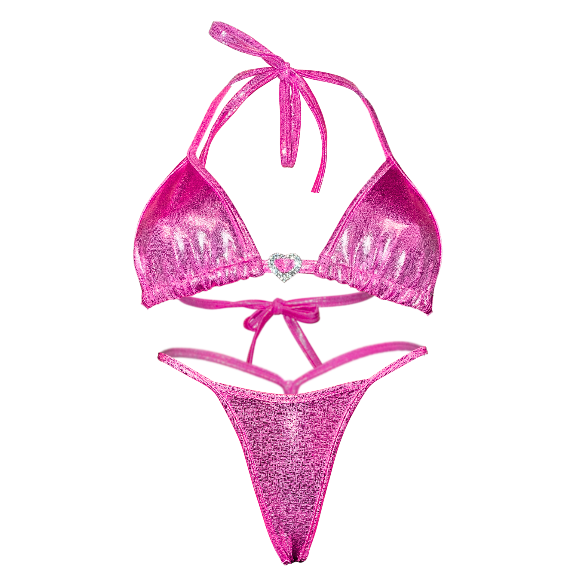 Two-piece holographic bikini set with heart jewel detail at the center of the top. Adjustable tie straps at the neck and back.