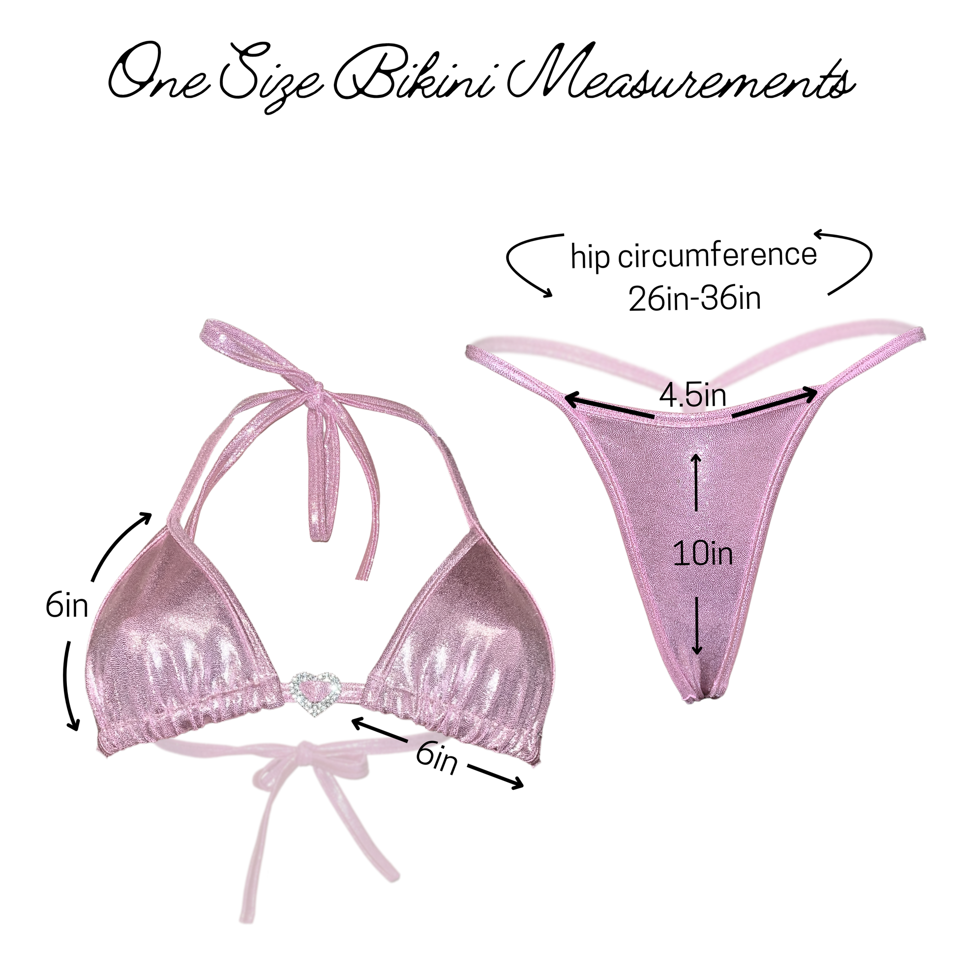 Two-piece holographic bikini set with heart jewel detail at the center of the top. Adjustable tie straps at the neck and back.