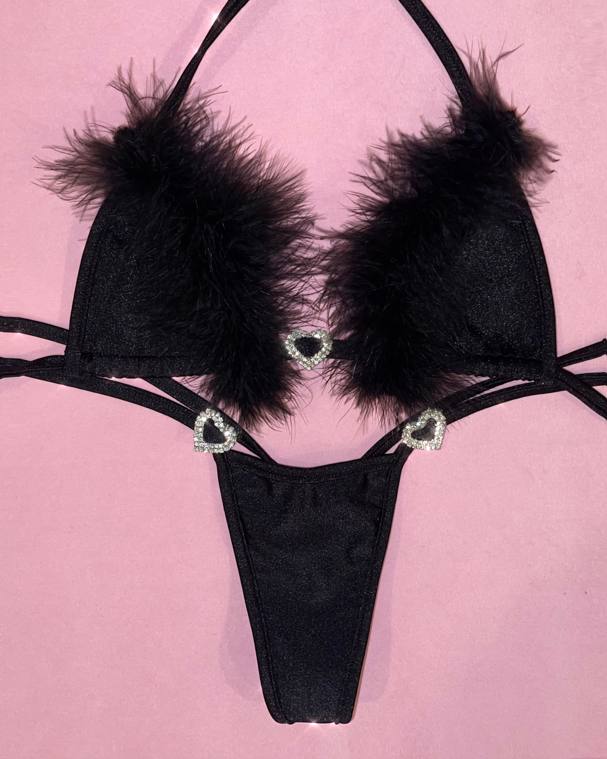 Thong Side-Tie Bikini With Marabou Feather Trim and Rhinestone Heart Embellishments